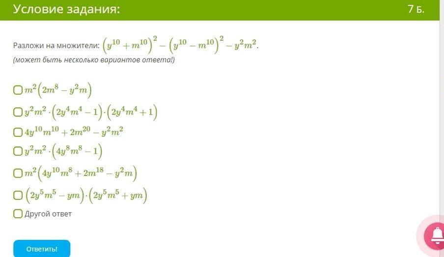Разложи на множители: (y10+m10)2−(y10−m10)2−y2m2 .