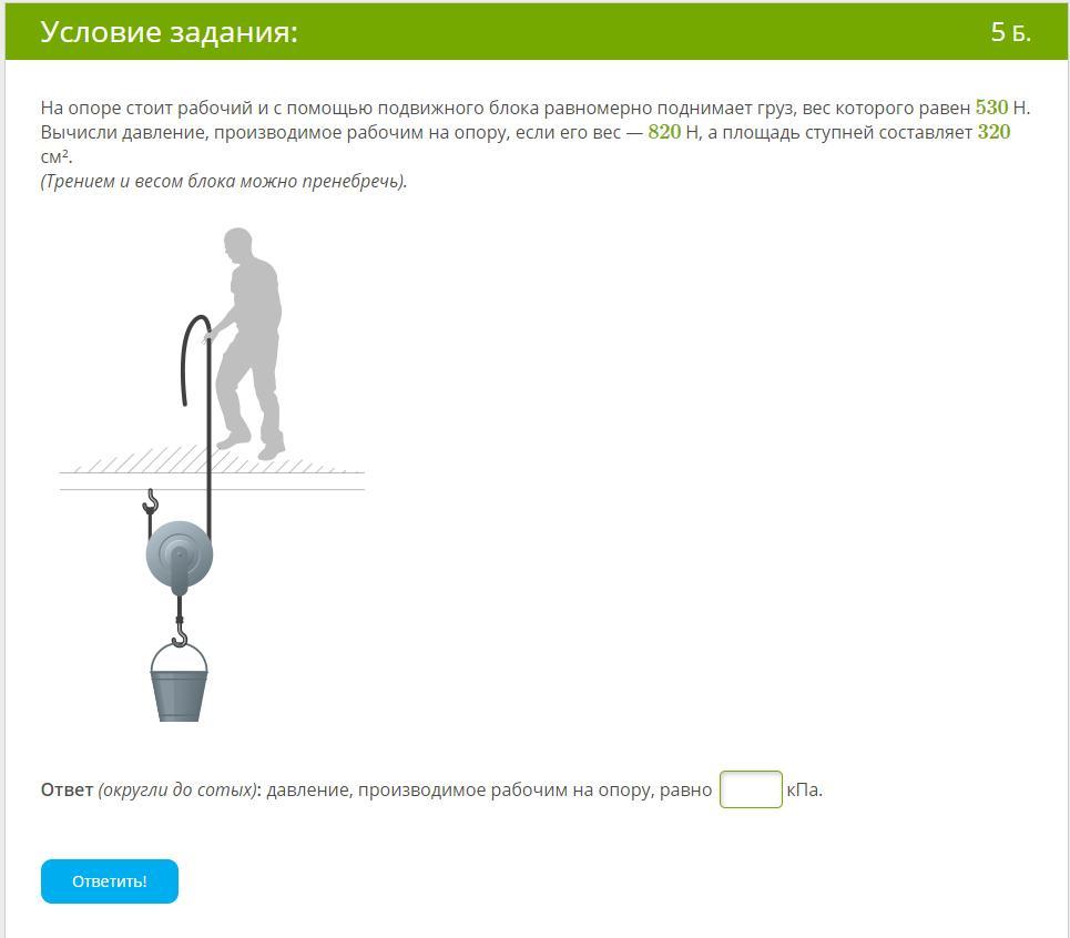 На опоре стоит рабочий и с помощью подвижного блока равномерно поднимает груз, вес которого равен 530 Н. Вычисли давление, производимое рабочим на опору, если его вес — 820 Н, а площадь ступней составляет 320см².