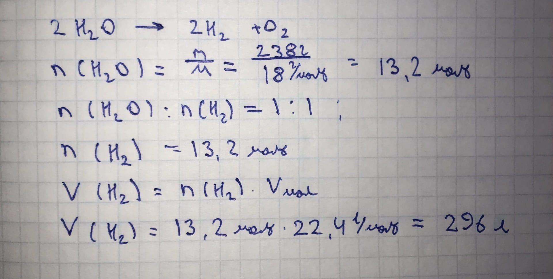 Найдите объем водорода, получившегося при разложении 238 г воды. Вода разлагается по схеме: H2O → H2 + O2↑