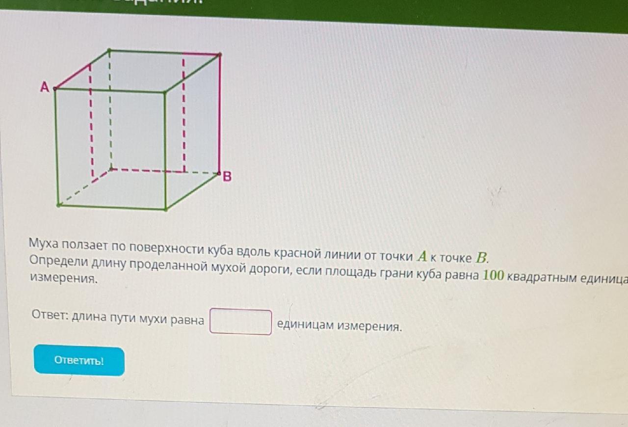 Определи длину проделанной мухой дороги, если площадь грани куба равна 100 квадратным единицам измерения.