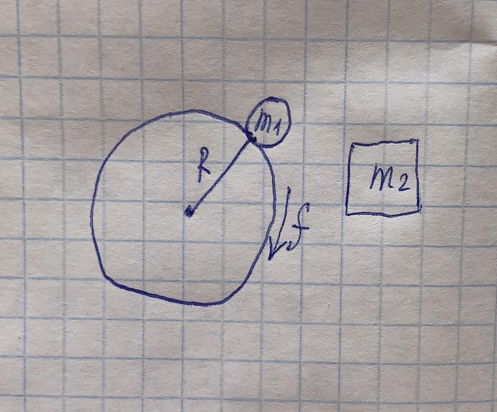Шар массой m1 = 0,8 кг вращается с частотой f = 1,5 об/с в радиусе R = 0,6 м. Какой импульс p2 и скорость v2 будут во втором объекте массой m2 = 4 кг, когда шар столкнётся с ним, если известно, что после удара шар остановился?