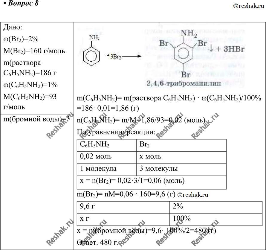 10. Вычисли массу бромной воды с массовой долей брома 2%, которая потребуется для полного взаимодействия со 186 г 1%-го раствора анилина.