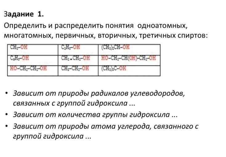 Определите и распределите понятия одноатомных, многатомный, первичных, вторичных, третичных спиртов