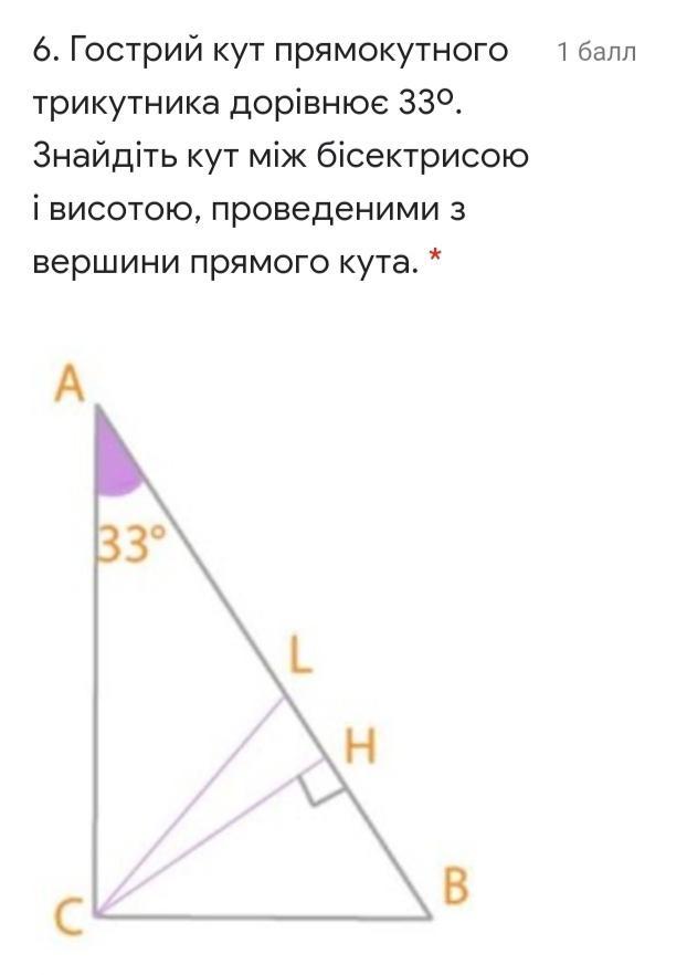т.к часть угла <HCB = 33° а полный угол <LCB=45° то часть, которая нам нужна: <LCH = 45°-33°=12°