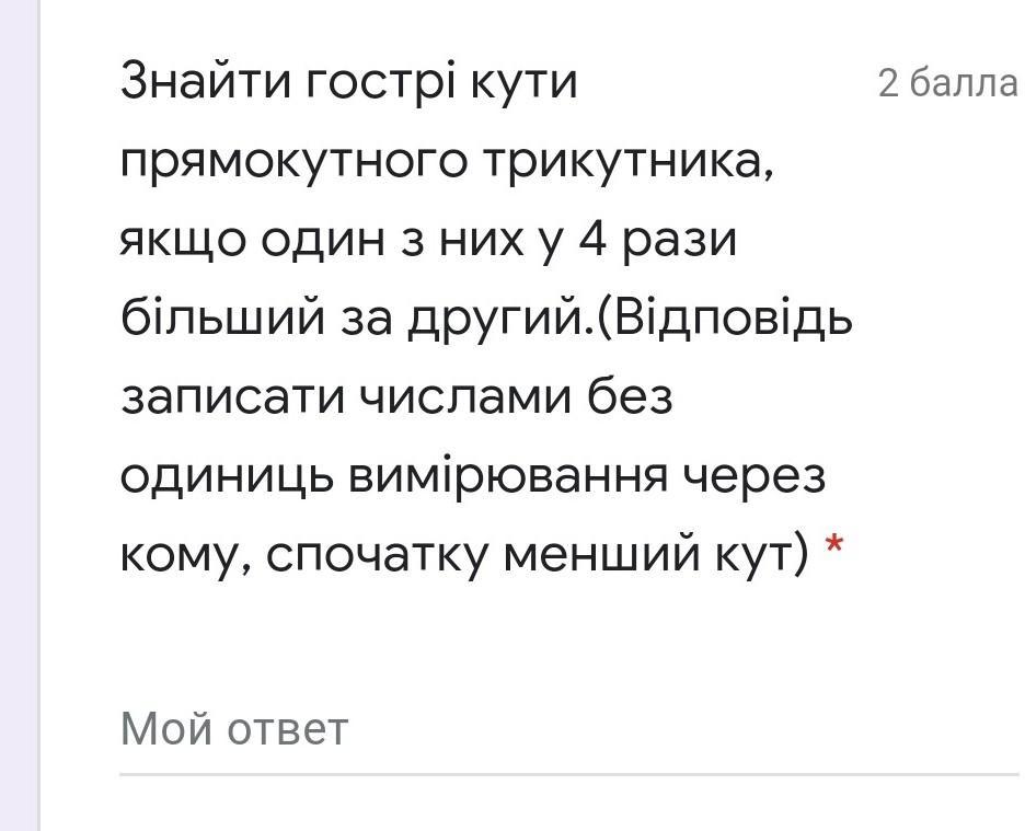 Задание :Найти острые углы прямоугольного треугольника, если один из них в 4 раза больше другой. (Ответ записать числами без единиц измерения через запятую, сначала меньший угол)
