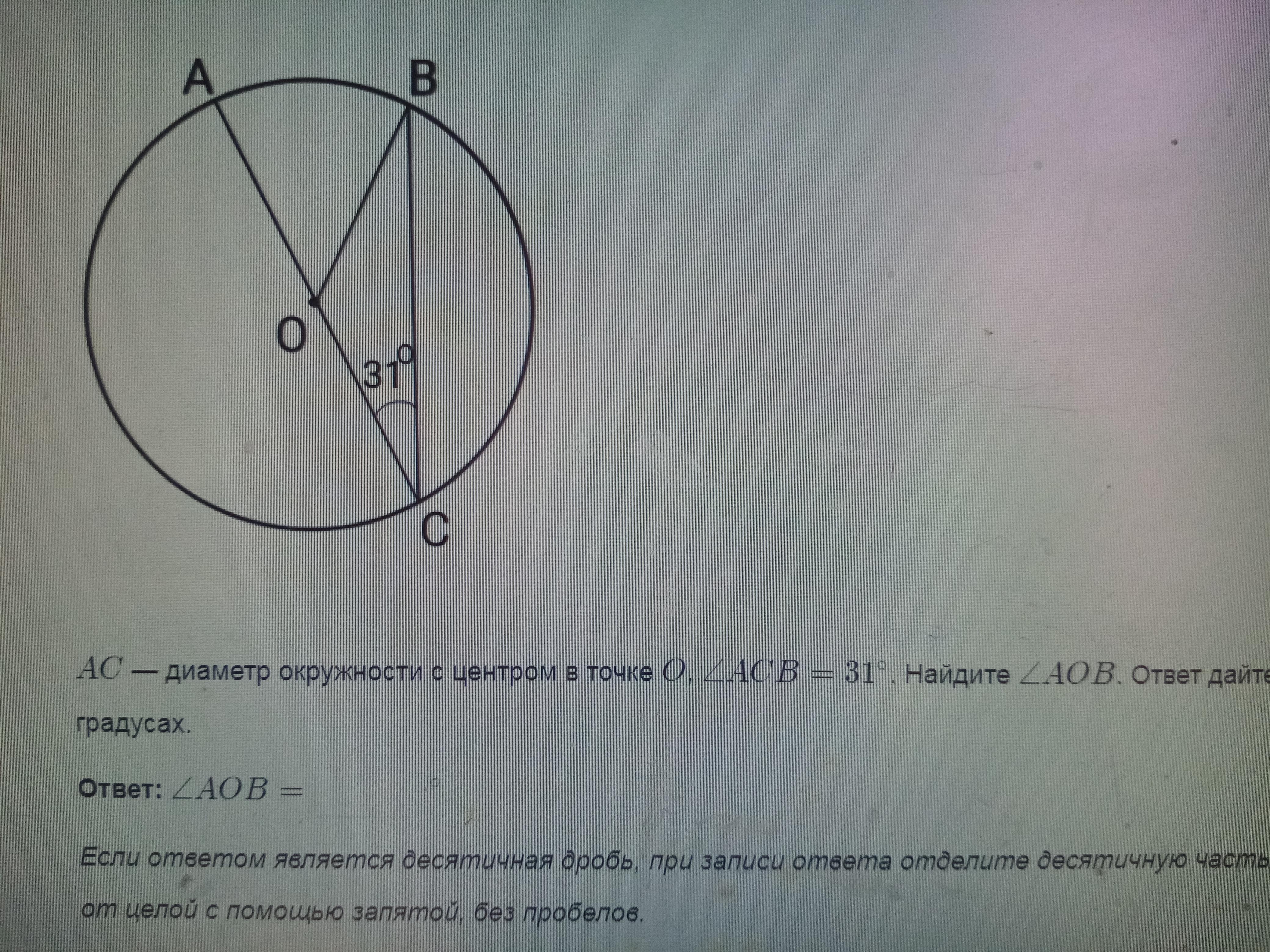 ❗ЭТО ОЧЕНЬ СРОЧНО, ПОМОГИТЕ ПОЖАЛУЙСТА❗AС-диаметр окружности с центром в точке О, угол ACB=31градус. Найдите угол АОВ. Ответ дайте в градусах.