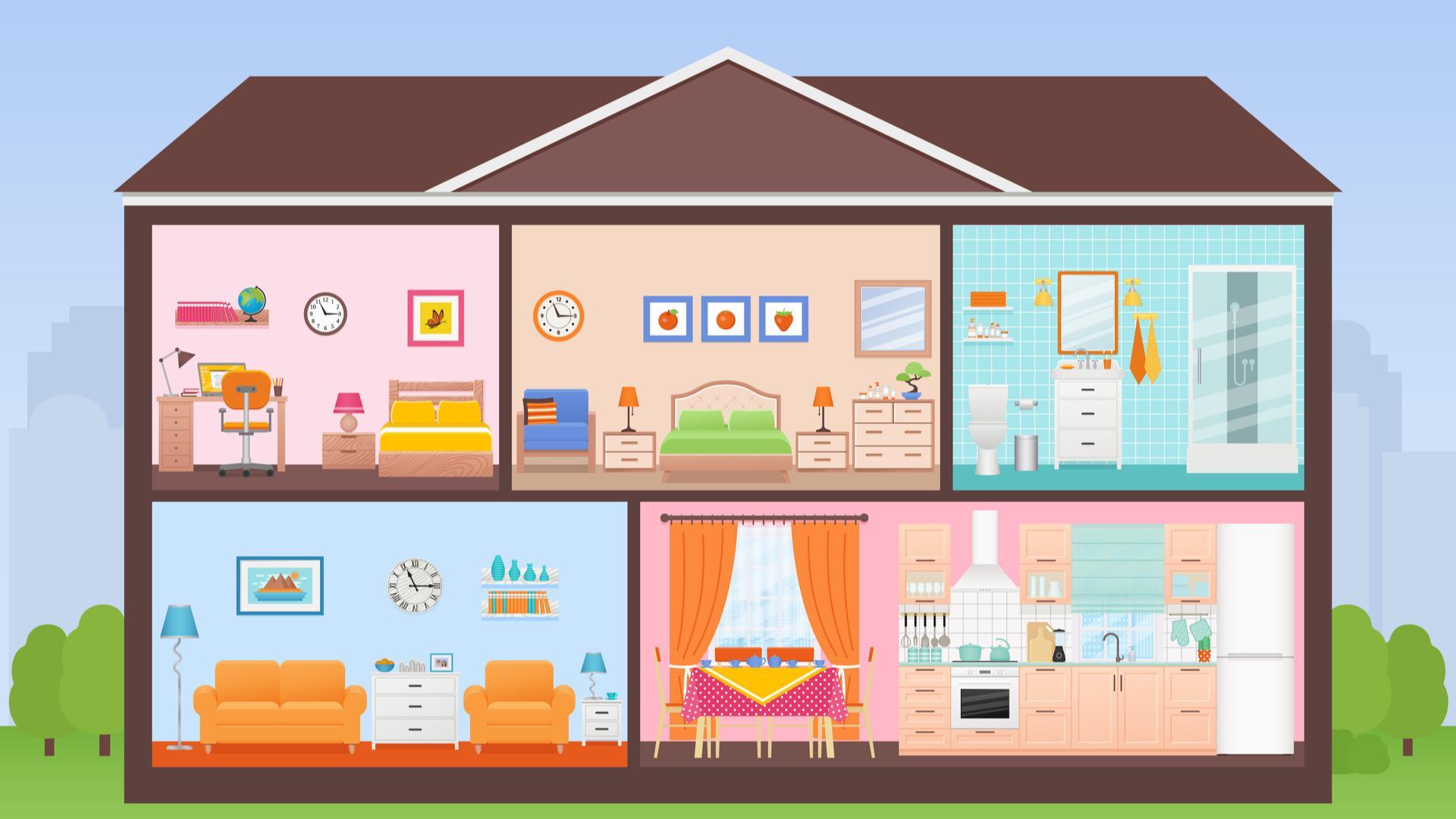 Посмотри на картинку. Представь, что ты живёшь в этом доме со своей семьёй или друзьями. Внимательно изучи изображение и придумай 15 словосочетаний с местоимениями, которые можно было бы использовать, проводя по дому экскурсию.