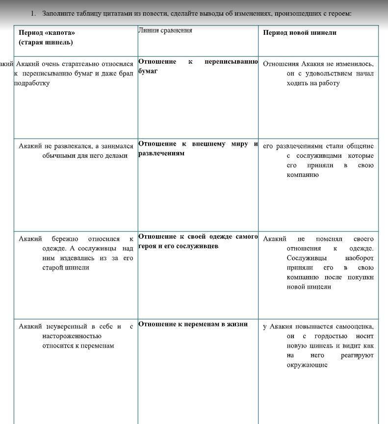 Н.В.Гоголь "Шинель" ЗАПОЛНИТЕ ТАБЛИЦУ