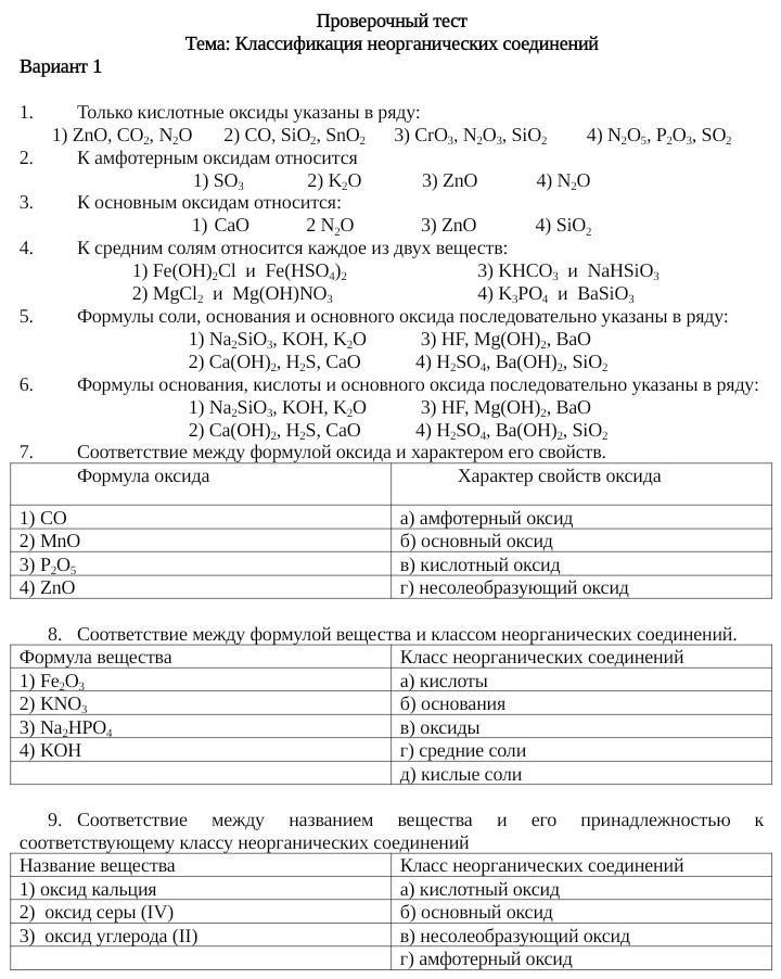 №8. Соответствие между формулой вещества и классом неорганических соединений.