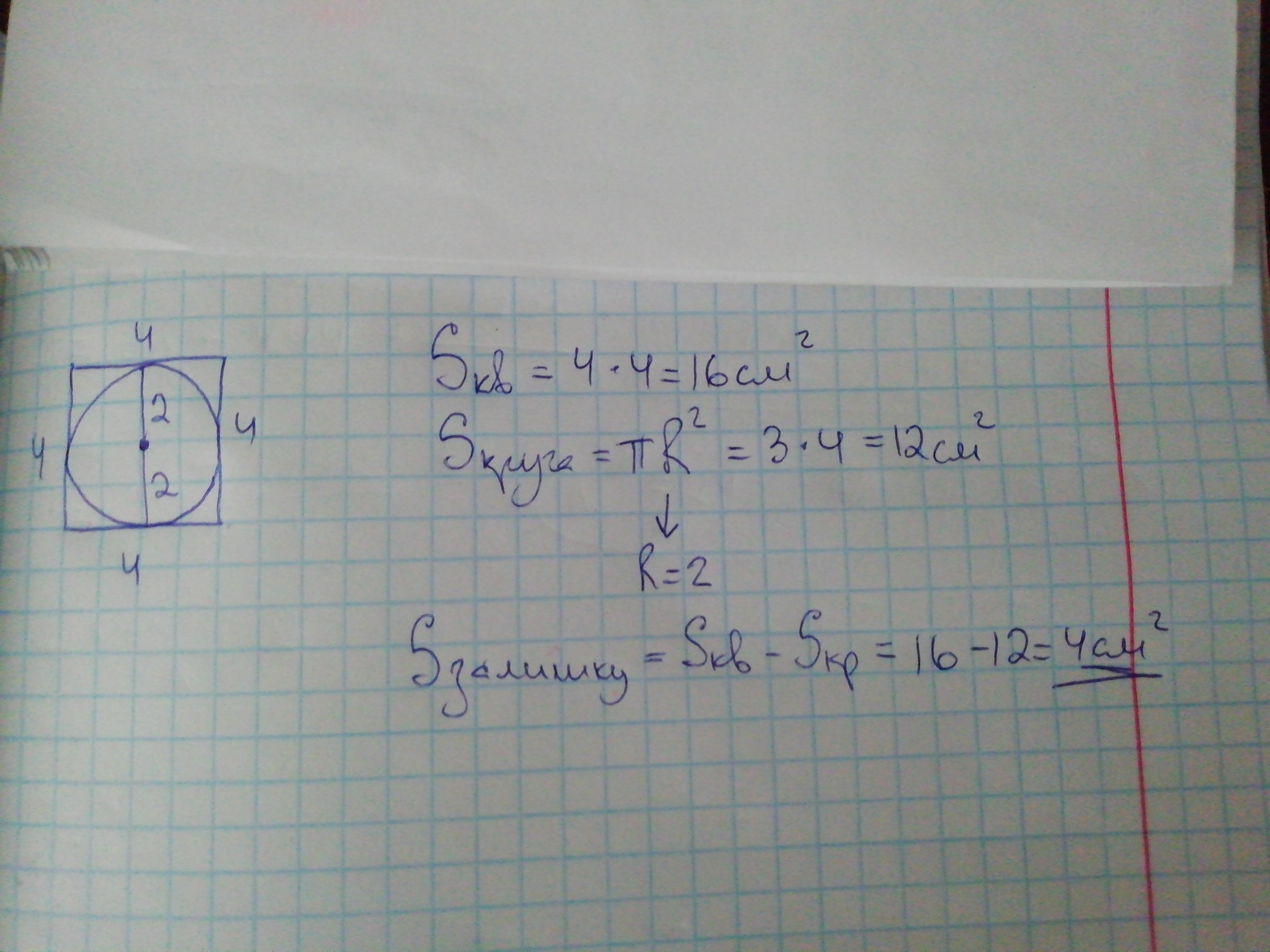 .В квадрат с периметром 16 см вписан круг. Найти площадь оставшейся части квадрата не заполненное кругом.(π =3). *