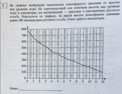 На графике изображена зависимость атмосферного давления от высоты над уровнем моря. На горизонтальной оси отмечена высота над уровнем моря в километрах, на вертикальной — давление в миллиметрах ртутного столба. Определите по графику, на какой высоте атмосферное давление равно 580 миллиметрам ртутного столба. Ответ дайте в километрах.