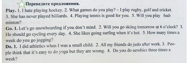 Я ненавижу хоккей. В какую игру ты играешь? - Я играю в регби, гольф и крикет. Она никогда не играла в бильярд. Игра в теннис хороша для тебя. Ты будешь играть в бадминтон?