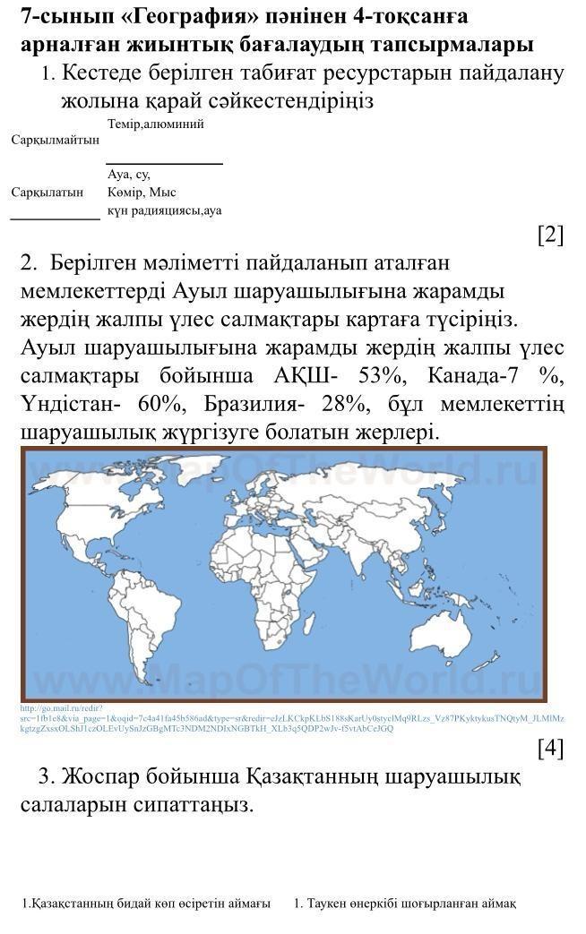7-сынып «География» пәнінен 4-тоқсанға арналған жиынтык бағалаудың тапсырмалары 1. Кестеде берілген табиғат ресурстарын пайдалану жолына карай сәйкестендіріңіз Темір, алюминий Саркылмайтын Aya, cy, Көмір, Мыс күн радияциясы, ауа Саркылатын [2] 2. Берілген мәліметті пайдаланып аталған мемлекеттерді Ауыл шаруашылығына жарамды жердің жалпы үлес салмақтары картаға түсіріңіз. Ауыл шаруашылығына жарамды жердің жалпы үлес салмақтары бойынша АҚШ- 53%, Канада-7 %, Үндістан- 60%, Бразилия- 28%, бұл мемлекеттің шаруашылык жүргізуге болатын жерлері.3. Жоспар бойынша Қазақтанның шаруашылық салаларын сипаттаңыз. Қазақстанның бидай көп өсіретін аймағы 1. Таукен өнеркәсібі шоғырланған аймақ