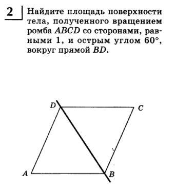 Найдите площадь поверхности тела, полученного вращением ромба ABCD, со сторонами равными 1 и острым углом 60, вокруг прямой BD.