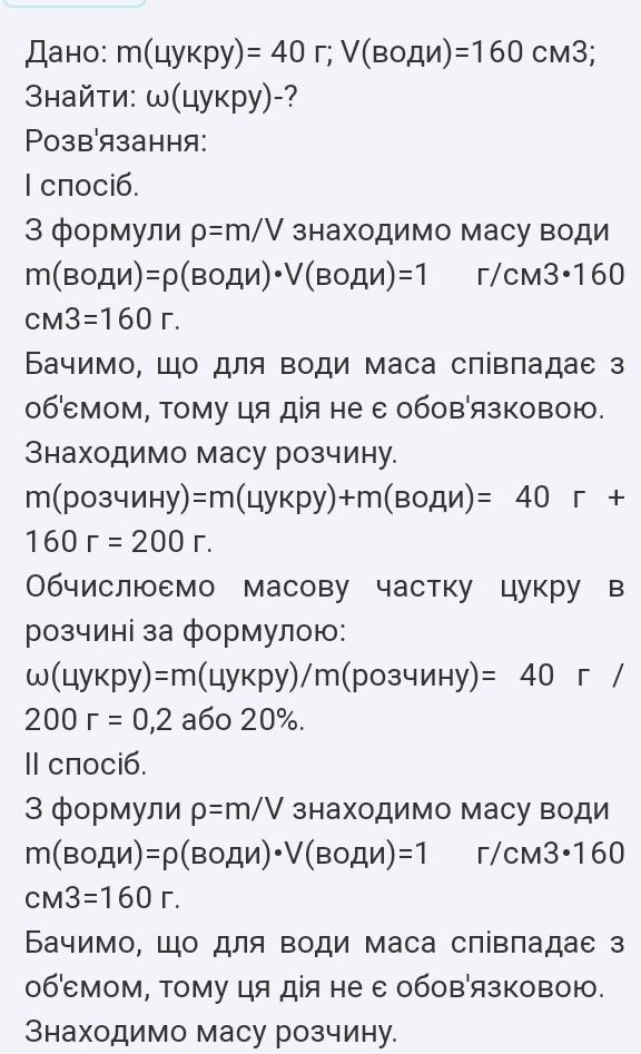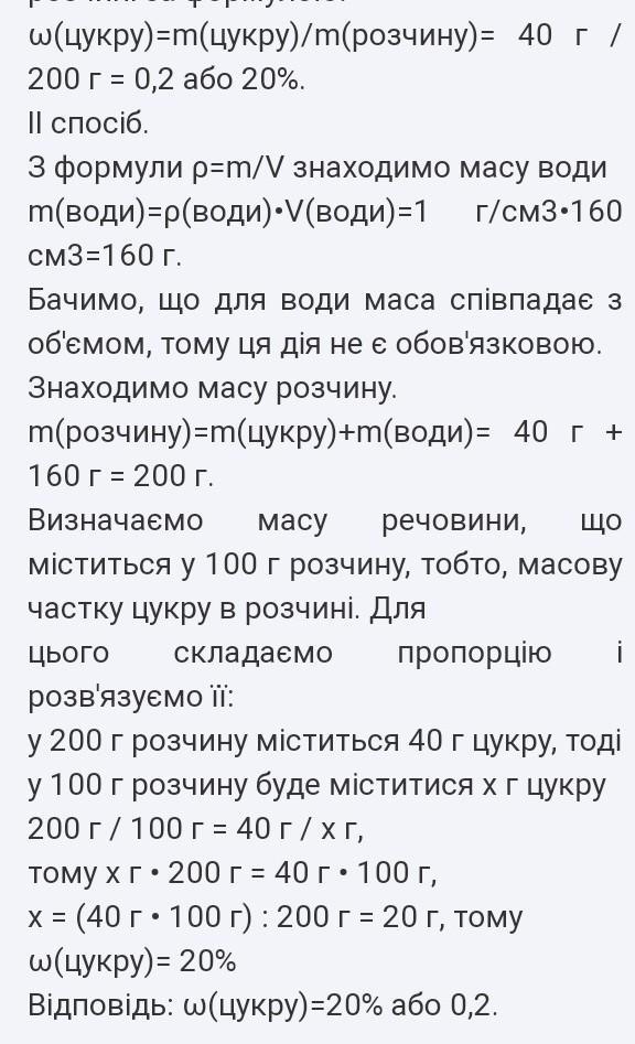 Яка масова частка (%) цукру в розчині, для виготовлення якого використали цукор масою 60 г і воду масою 140г?