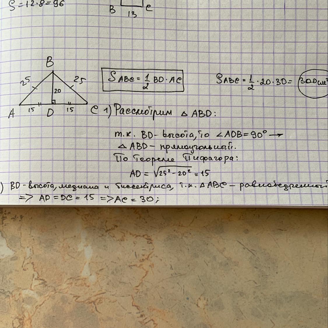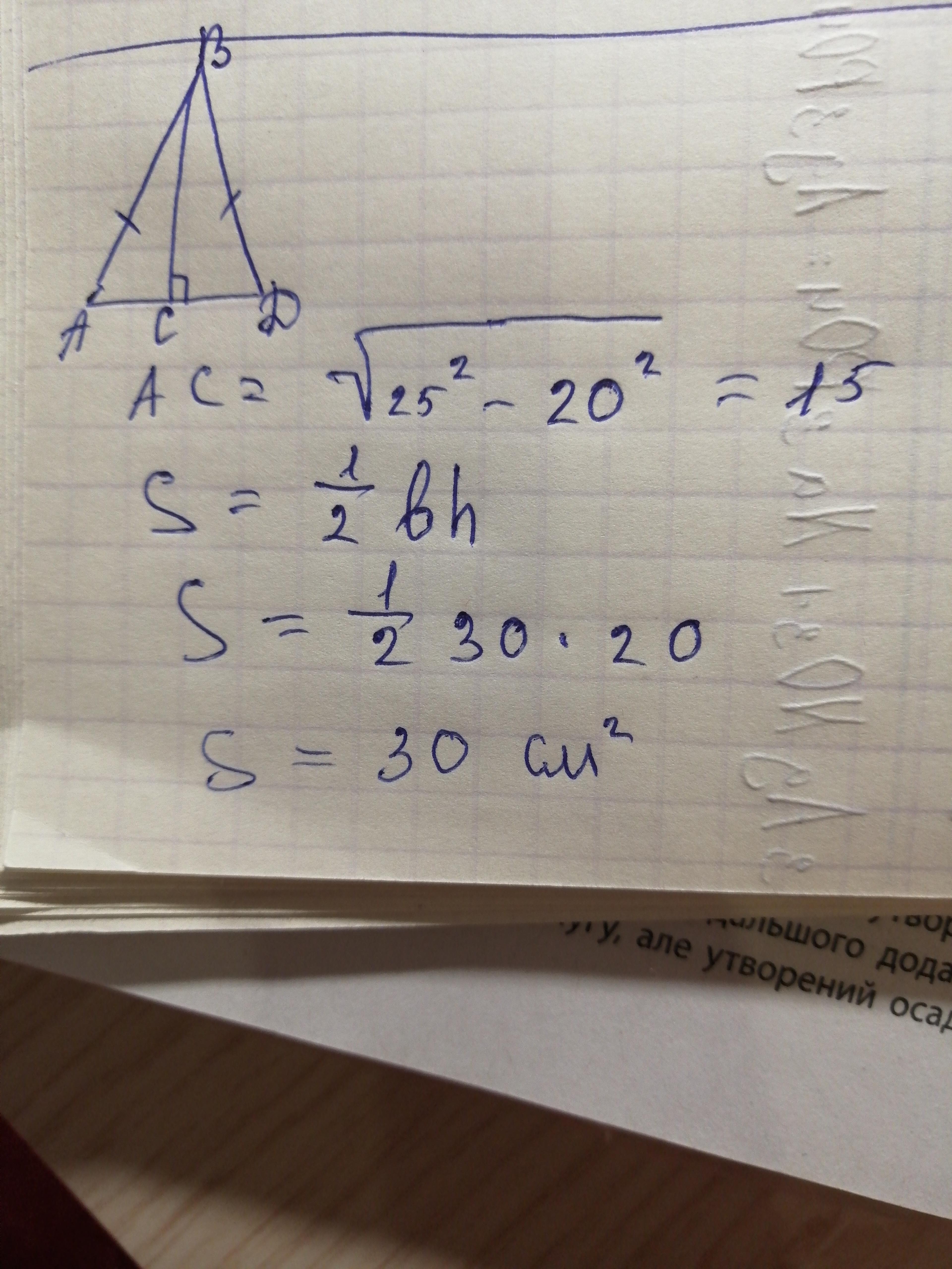 дорівнює 25 см, а висота, опущена на основу, - 20 см. Помогите