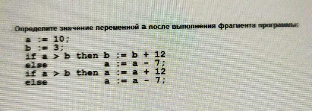Если А больше B тогда а равно А + 12, в противном же случае (если А не больше B), тогда А равно А - 7.