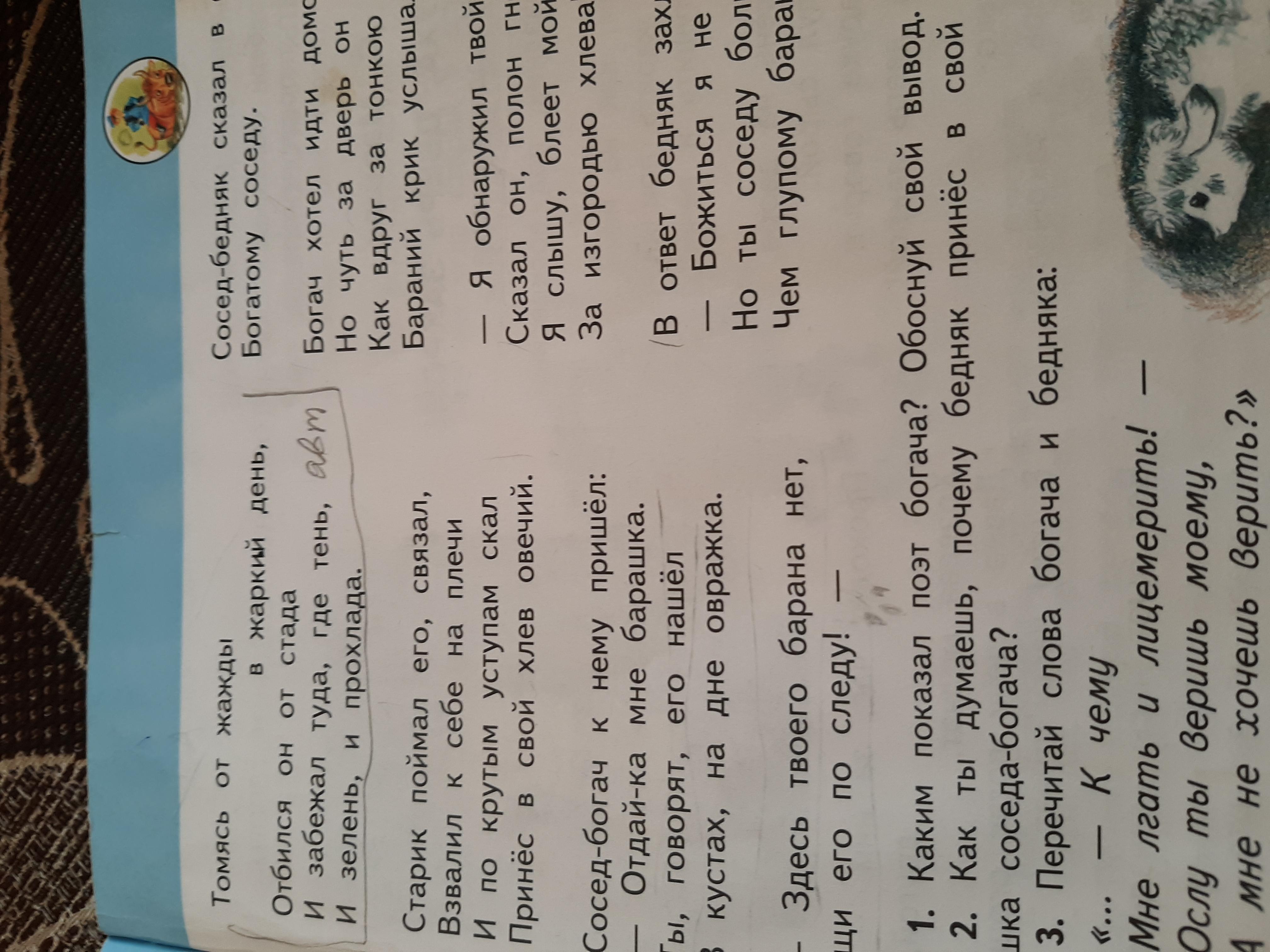 Поэт показал богача как жадного человека , лжеца и лицемера.Ему жалко дать осла взаймы бедняку ,и он нагло лжёт соседу.Даже когда осёл ,ушедший погулять,начинает кричать в сарае,богач пытается оправдываться,что нужно верить не ослу,а человеку.Это говорит о глупости и беспринципности этого человека.Также богач очень ленив, у него нет работы и его осёл томится в сарае.