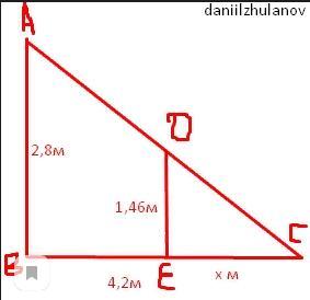Как-то вечером девочка захотела узнать, какой длины будет тень от дерева во дворе. Длина тени оказалась равна 4,2 м. Девочка знает, что высота дерева составляет 2,8м. Чему будет равна длина тени девочки, если её рост равен 146см?