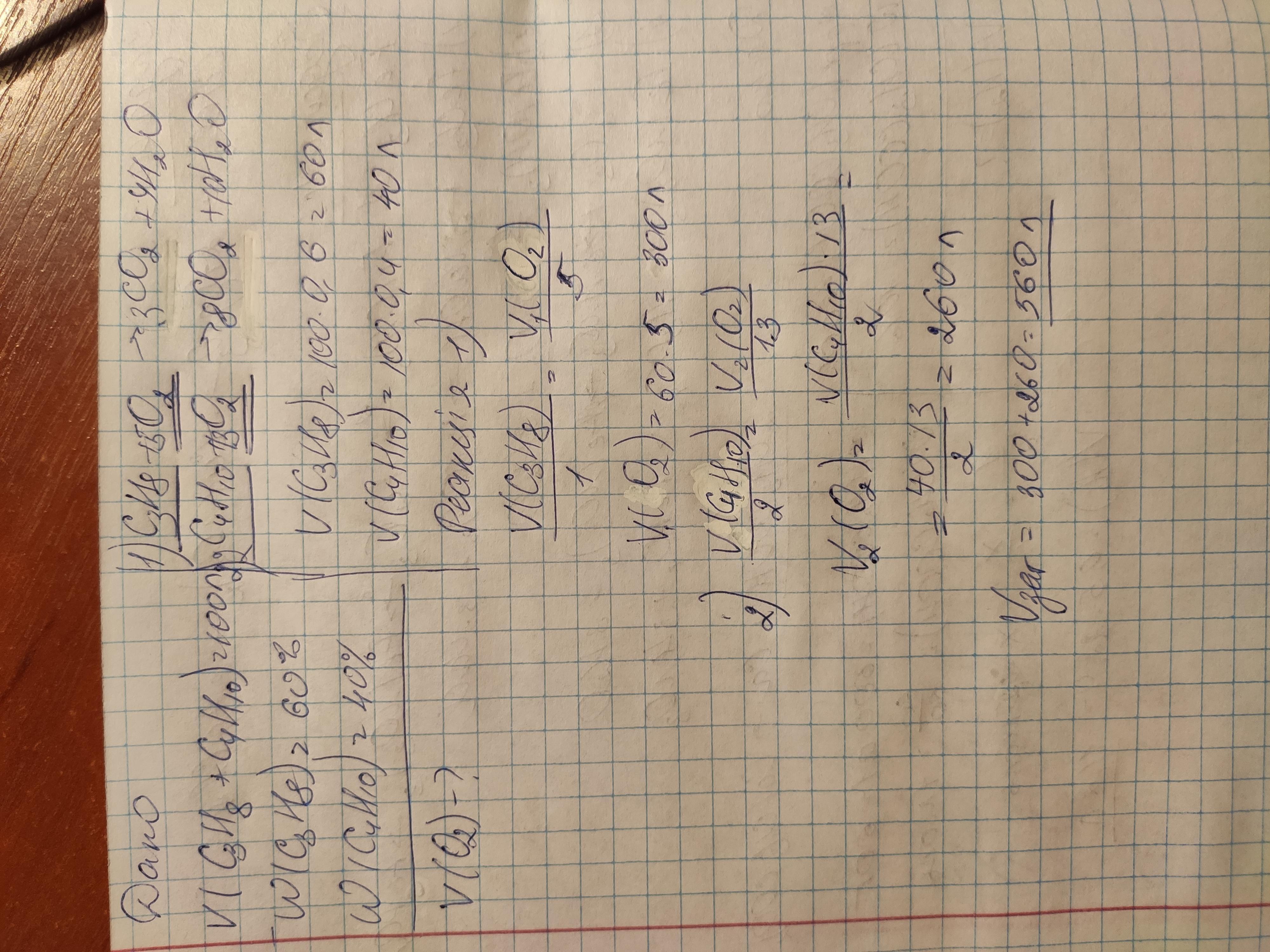 0бчисліть який об'єм повітря витратиться на спалювання 100 л суміші, яка складається із 60% пропануі 40% бутану(за об'ємом).