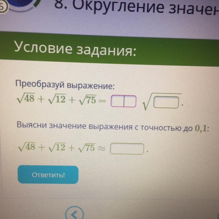 2) √48+√12+√75 ≈ 19,052 (но нужно ли округлять? если да, то можно округлить до 19,1 если нет, то 19,0 те 19.)