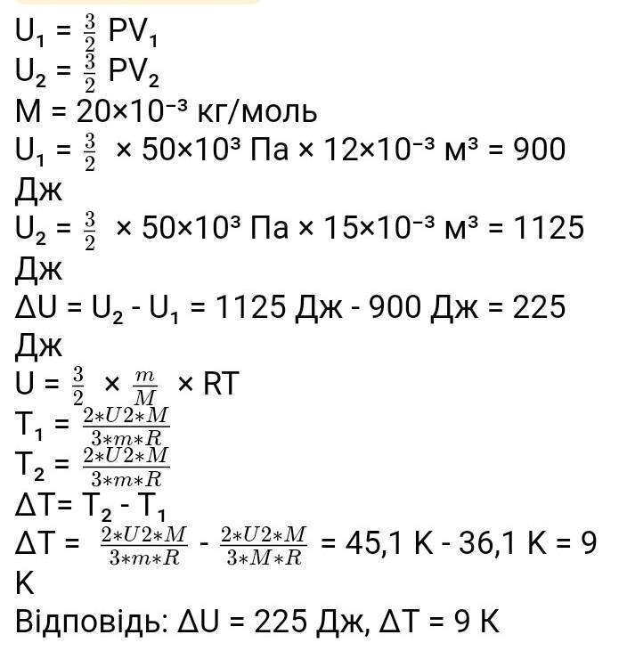 Відповідь: ΔU = 225 Дж, ΔТ = 9 К