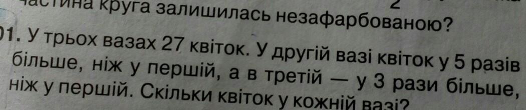 Нехай у 1 вазі=х, тоді у 3 вазі=3х, у 2 вазі=5х. Разом 27 квіток.