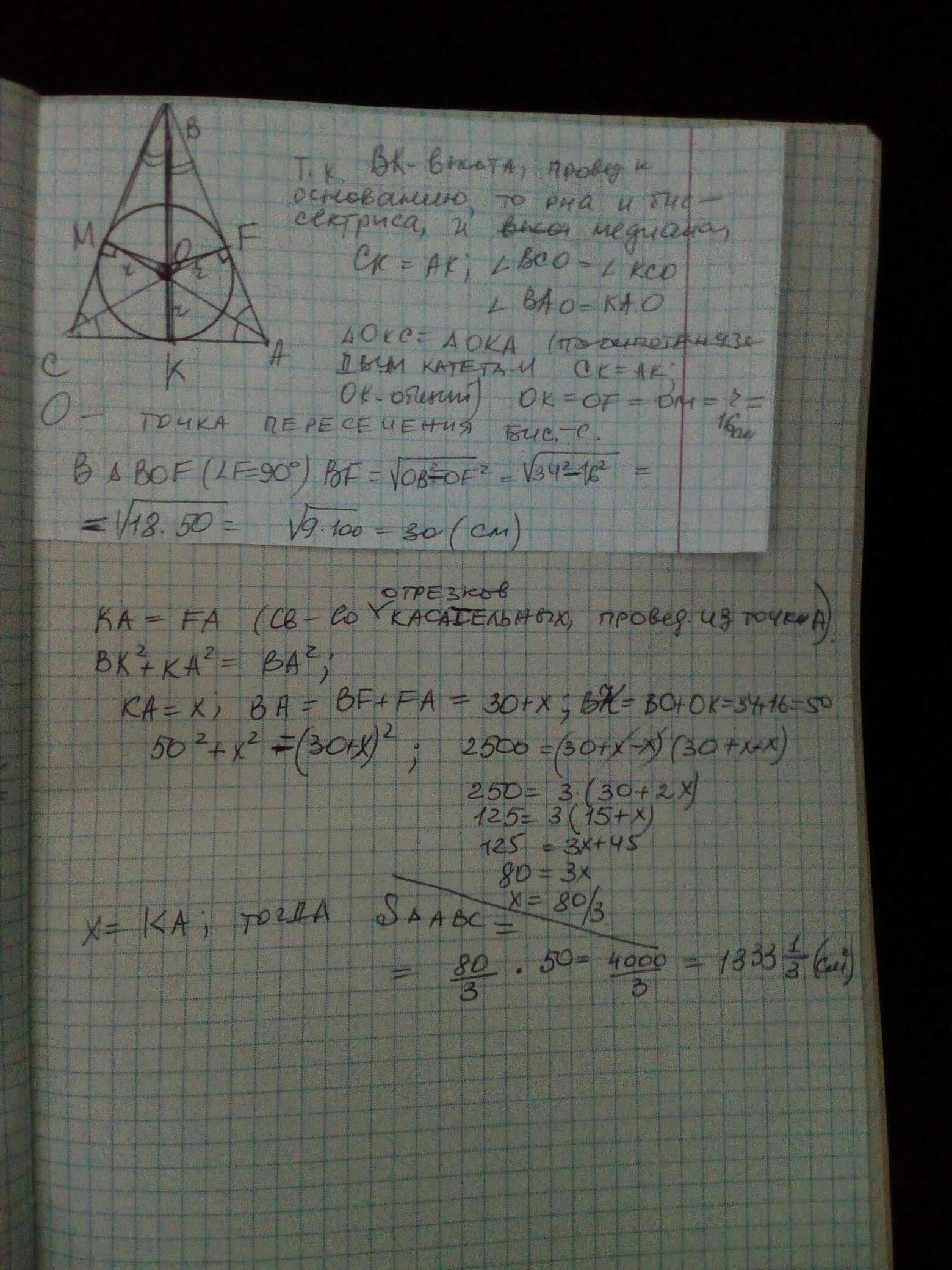 4. Центр кола, вписаного в рівнобедрений трикутник, ділить його висоту, проведену до основи, на відрізки, довжини яких дорівнюють 34см та 16см. Знайти площу даного трикутника.