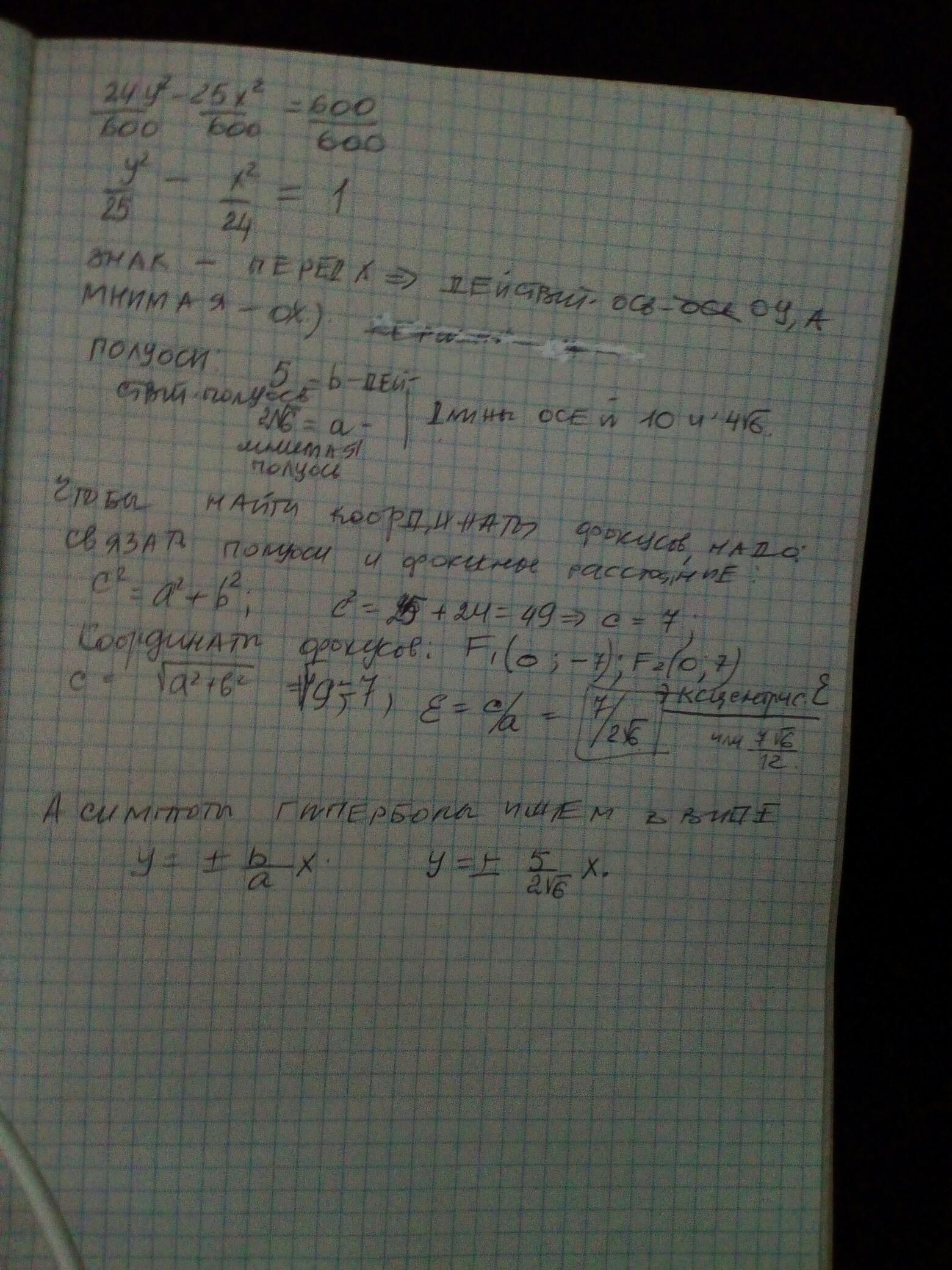 3. Дана гіпербола 24у² – 25х² = 600. Визначити довжини осей, координати фокусів, ексцентриситет. Записати рівняння асимптот.