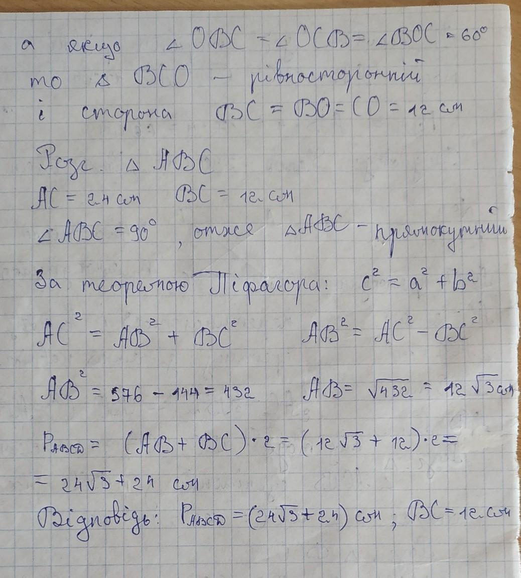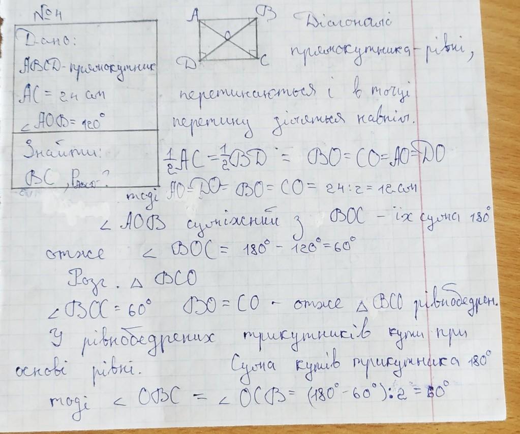 Діагональ прямокутника дорівнює 24 см, кут між діагоналями дорівнює