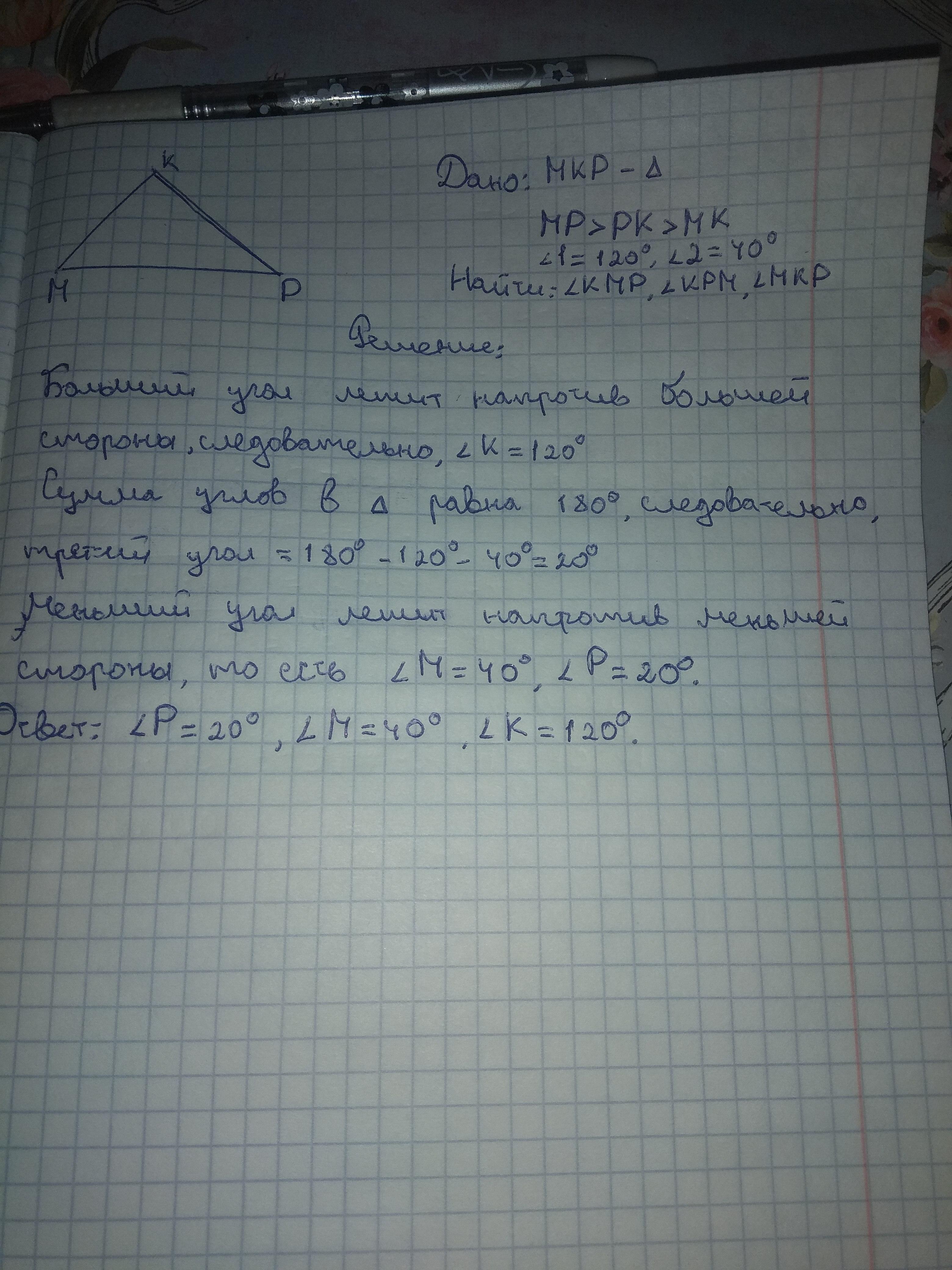 Дан треугольник МРК, известно, что МР>PK>МК. Найдите углы треугольника МРК, если известно, что один из углов равен 120⁰, а другой 40⁰