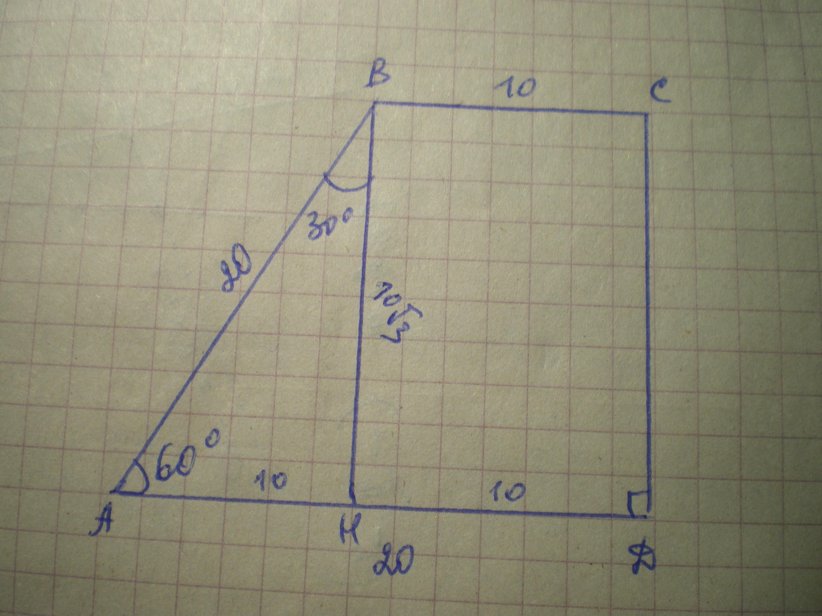 Знайти площу трапеціёї ABCD BC=10 см AD=20 см кут D=90 градусов кут альфа=60 градусов