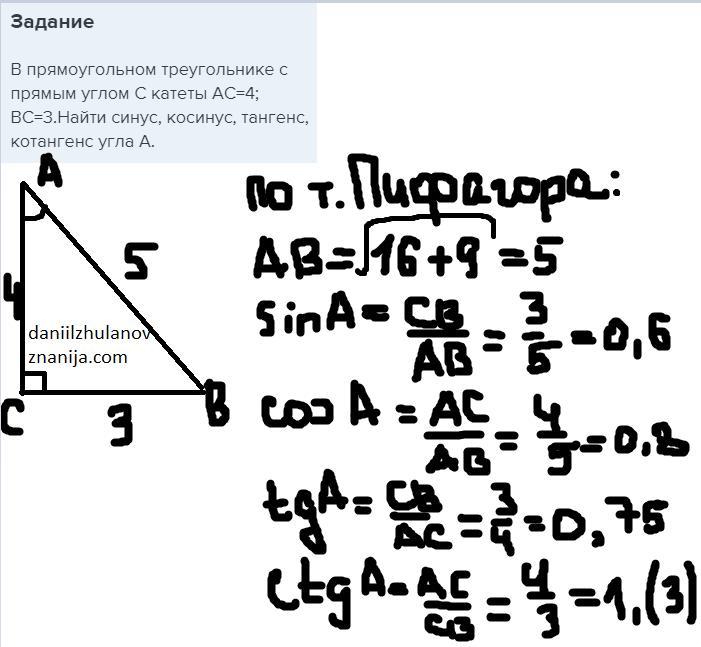 ВС=3.Найти синус, косинус, тангенс, котангенс угла А.