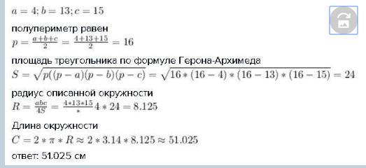 1. Стороны треугольника 13см, 4см, 15см, а радиус описанного круга 8frac{1}{8} см. Найти площадь треугольника.