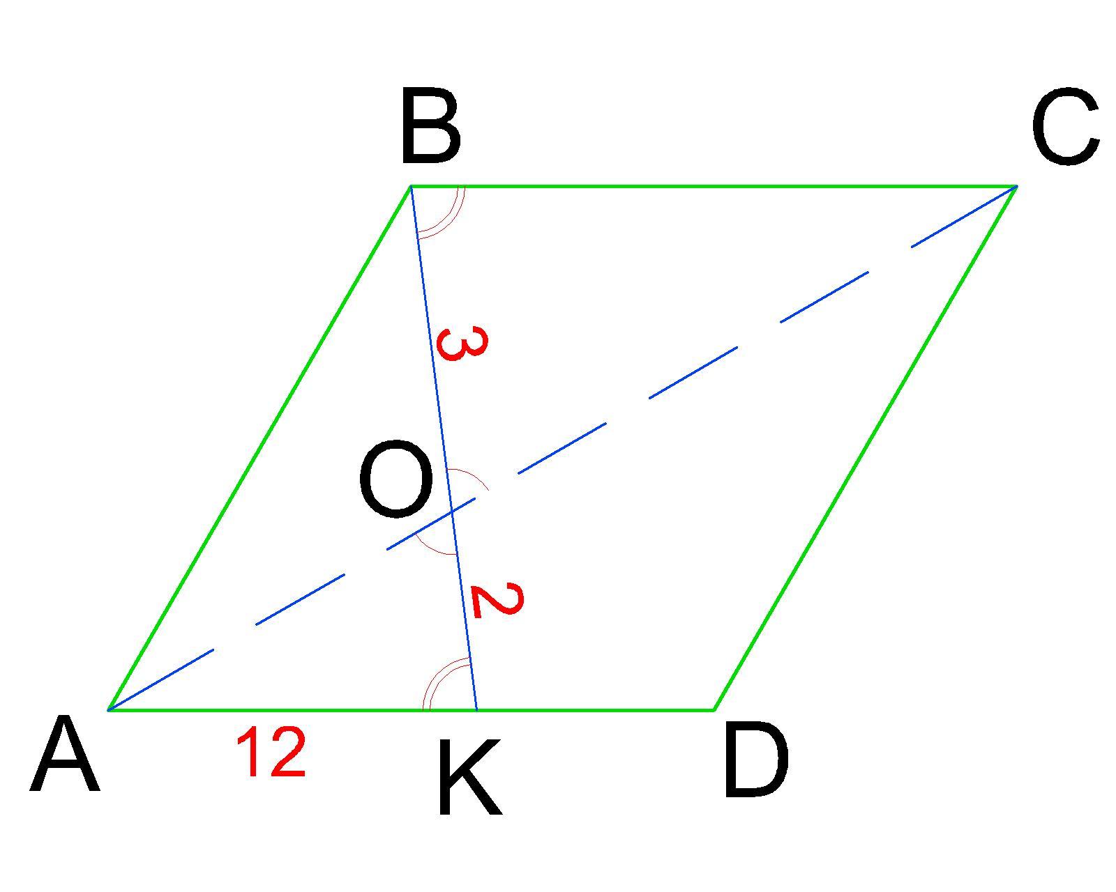 У паралелограмі ABCD на стороні AD вибрано точку К. Діагональ АС і відрізок ВК перетинаються в точці О. Визначте довжину сторони ВС , якщо АК =12 см,ОК = 2 см, ОB =3 см