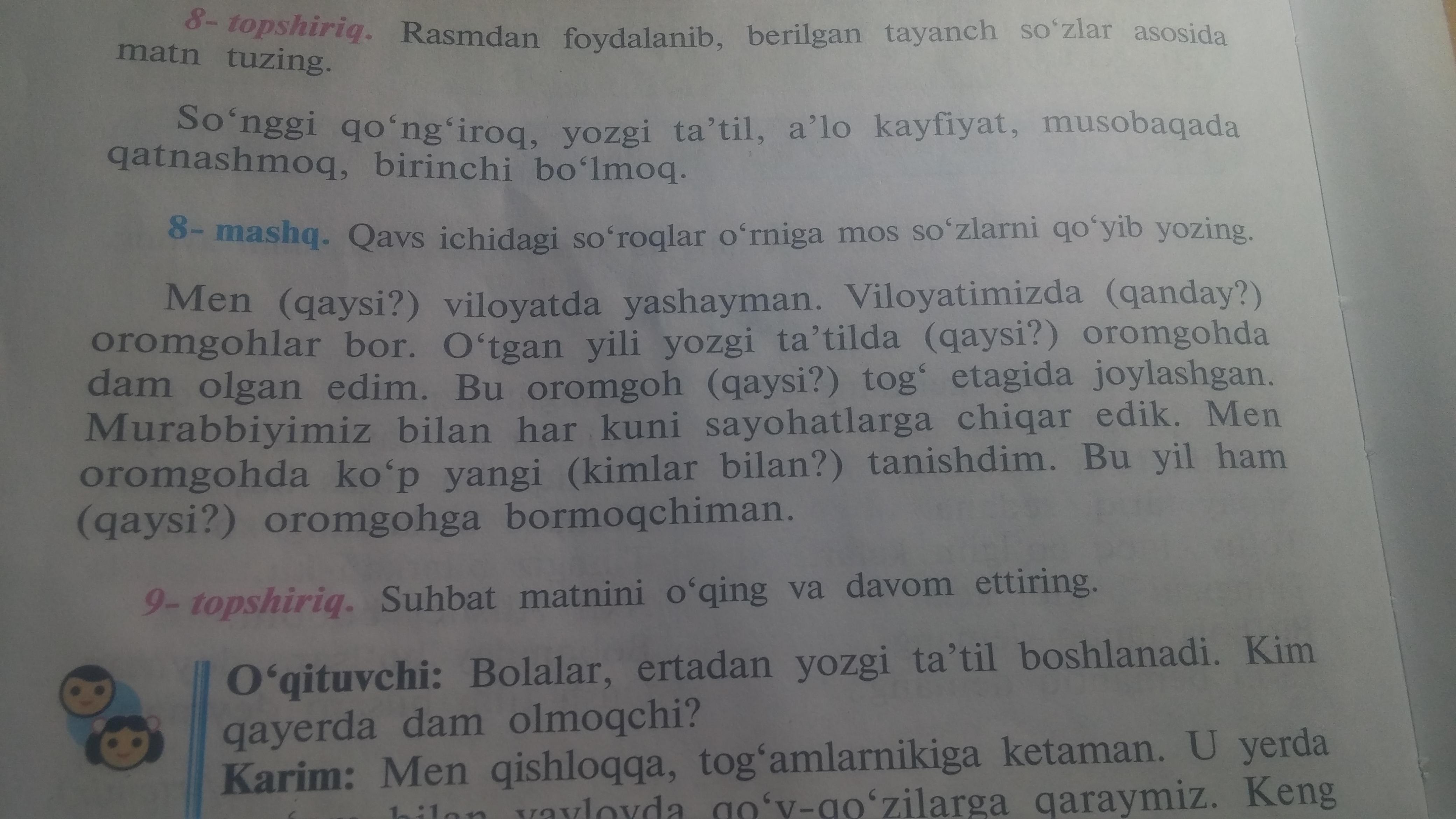 Men Toshkent viloyatida yashayman. Viloyatimizda "Kamalak" , "Quyoshcha" oromgohlar bor. O'tgan yili yozgi ta'tilda "Kamalak" oromgohda dam olgan edim.Bu oromgoh Chimyon tog' etagida joylashgan. Murabbiyimiz bilan har kuni sayohatlarga chiqar edik. Men oromgohda ko'p yangi do'stlar bilan tanishdim. Bu yil ham "Quyoshcha" oromgohga bormoqchiman.