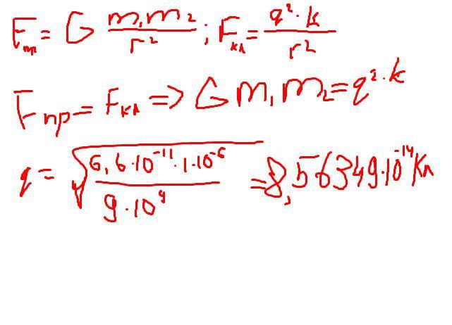 Дано дві кульки масою 1 г кожна. Який заряд треба надати кожній із них, щоб сила їх взаємного відштовхування врівноважила гравітаційну силу притягання? Кульки перебувають у повітрі.