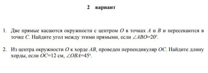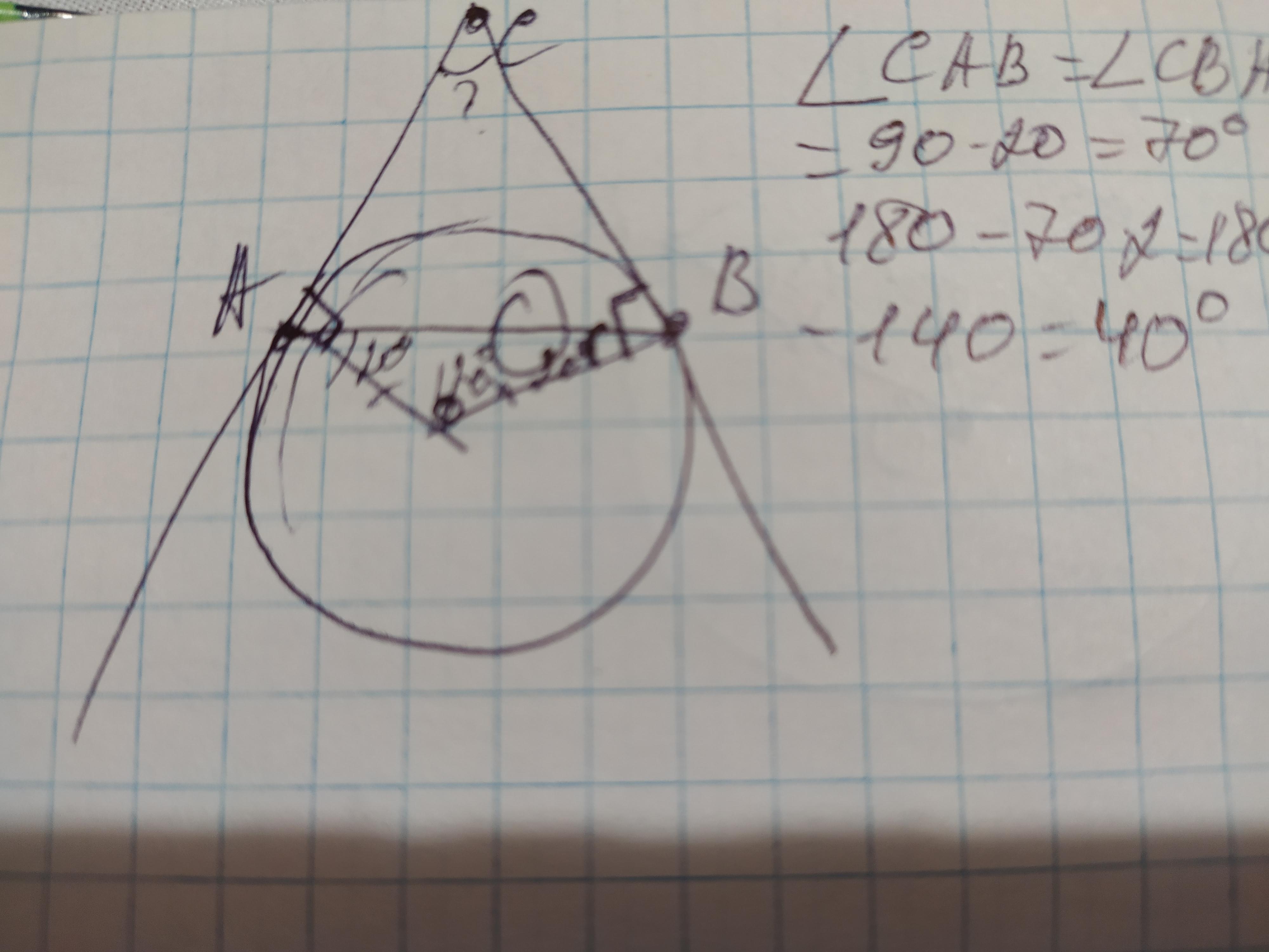 рассмотрим полученный ∆АОВ. В нём АО=ВО=радиусу, значит этот треугольник равнобедренный и его углы АВО и ВАО равны. Зная, что отрезок, проведённый из центра окружности к точкам касания с прямой, образует угол 90°, мы можем найти угол САУ в ∆АСВ: угол САУ= углу СВА=90-20=70°. ∆АСВ - равнобедренный, поскольку, точки А и В, касаясь окружности пересекаются в одной точке.
