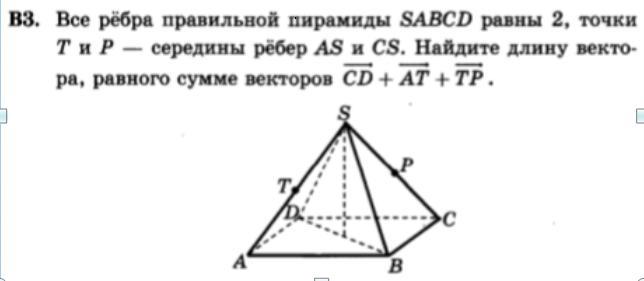 Объяснение: (→CD)+(→AT)+(→TP) = (→CD)+(→AP) = (→→BA)+(→AP) = →BP Эта сумма векторов равна вектору BP. Это высота правильного треугольника SBC со стороной 2, и посему равна √3