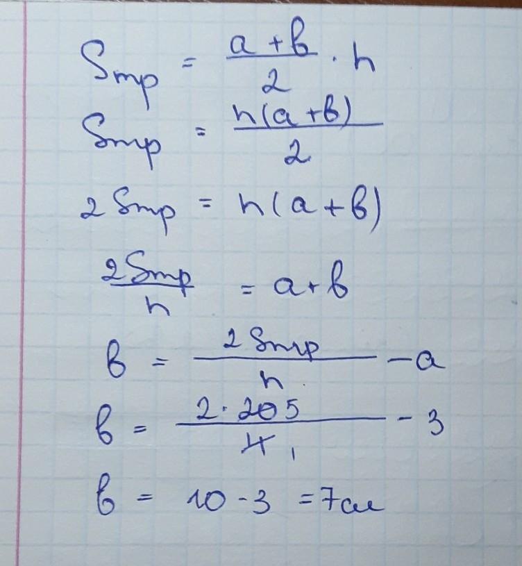 Площа трапеции = 20см2 , а её высота - 4см. Найти не видому основу трапеции ,если её другая основа = 3см ????