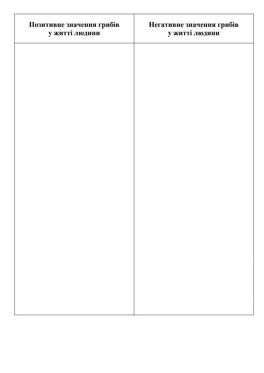 створіть таблицю з колонками (2) про: позитивні значення грибів у житті людини і негативні значення грибів у житті людини