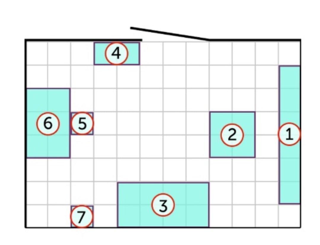На плане изображена предполагаемая расстановка мебели в гостиной после ремонта.Сторона каждой клетки равна 0,5 м. Гостиная имеет прямоугольную форму. Единственная дверь гостиной деревянная, в стене напротив двери расположено окно. Справа от двери будет поставлен комод, слева от двери у стены будет собран книжный шкаф.В глубине комнаты у стены планируется поставить диван. Перед книжным шкафом будет поставлено кресло.Справа от дивана будет стоять торшер. Площадь, занятая диваном, по плану будет равна 2 кв.м. У стены справа от двери планируется поставить письменный стол, а перед ним поставить стул.