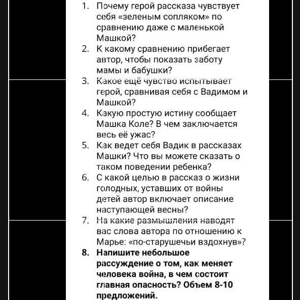 1.Потому что он как ни старался быть понимающим, а если надо, и абсолютно взрослым человеком, все его старания не всегда помогали, потому что Вадим и даже маленькая Машка знали горького гораздо больше, чем я. Он говорил все время я в этом виноват . 2 Мама и бабушка стараются уберечь Колю от голода и прочих превратностей войны. Война подходит к концу, но еды не хватает, и мальчик постоянно голоден. извините больше незнаю