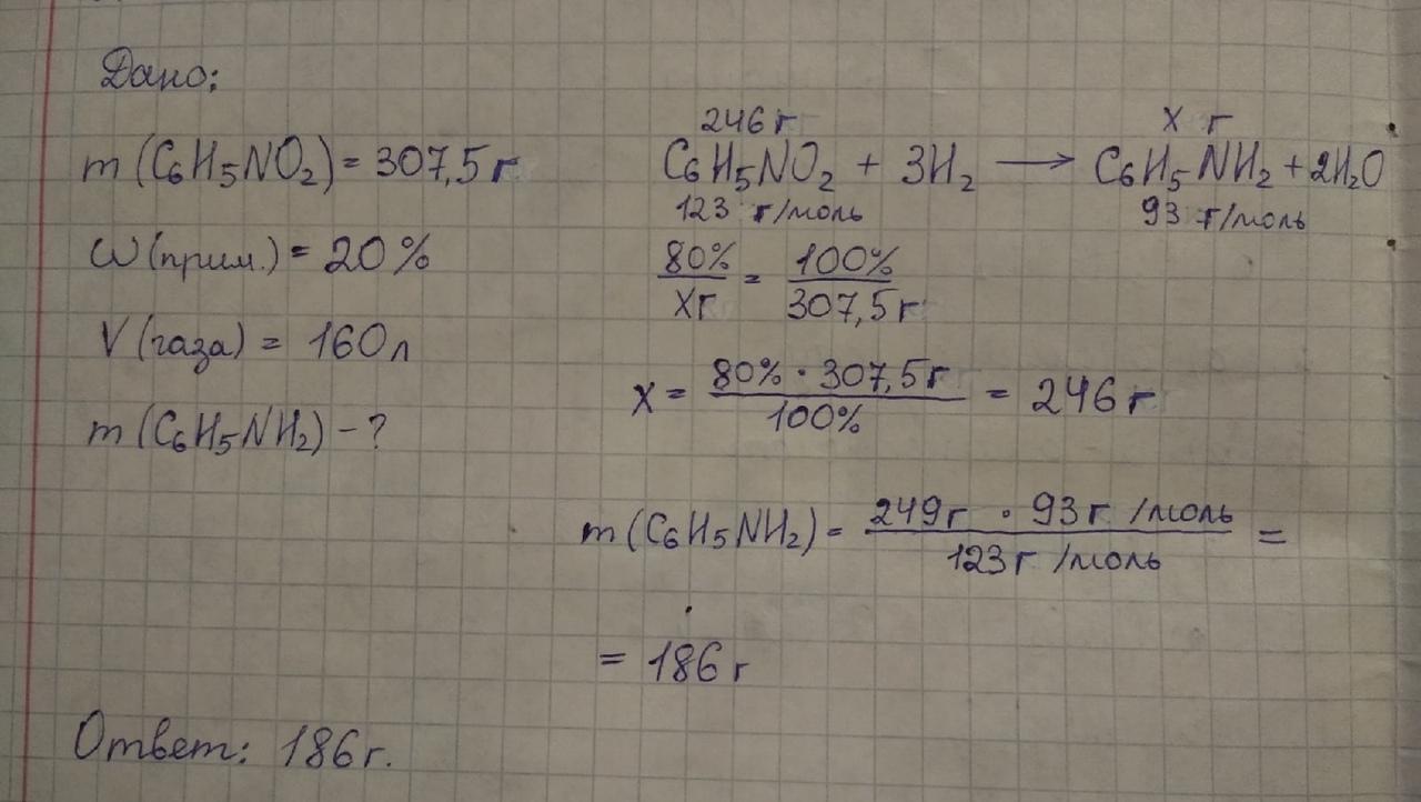 Вычислите и укажите массу фениламина, который образуется в результате взаимодействия нитробензола массой 307,5 с массовой долей примесей 20 % с газом объёмом 160 л по реакции ЗИНИНА.ПОМОГИТЕ НУЖНО ЗДАТЬ СЕГОДНЯ!!!