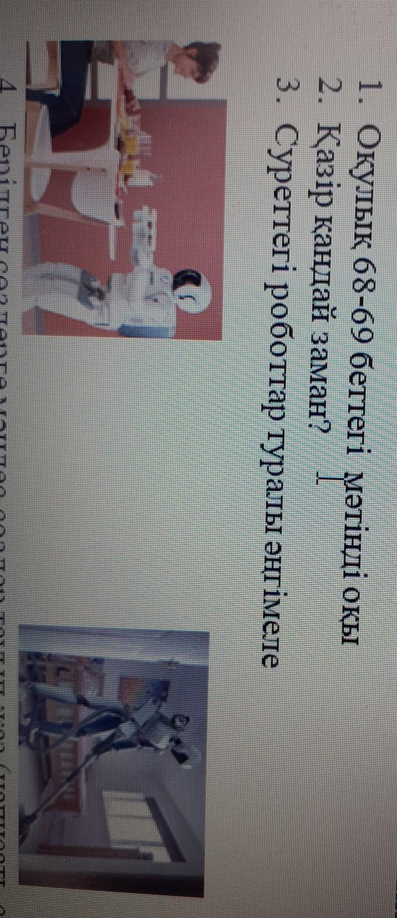 1.Бірінші суретте робот адамға тамақ әкеліп жатыр. Бұл адамзаттың шығарған туындысы. Ол робот адамның айтқаның істеп жатыр.