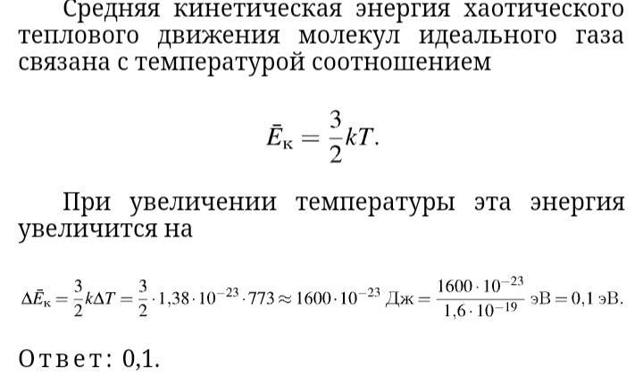 Температура порции идеального газа увеличилась на 773 К. На сколько возросла средняя энергия хаотического теплового движения одной молекулы, входящей в состав этой порции газа? Ответ выразите в электронвольтах и округлите до десятых долей.