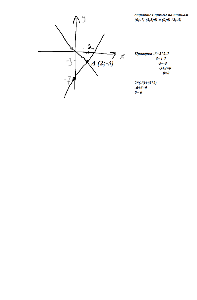 Строите прямоугольную систему координат. Оба уравнения - это уравнения прямых. Для их построения достаточно двух точек. Например, для первой системы: х=0 у=-7 и х=1 у=-5. Через эти две точки проводите прямую. Для второй системы: х=0 у=0 и х=1 у=-1,5. И через эти две точки проводите прямую. В какой точке пересекутся, такой и будет ответ. У меня получилось: х=2 у=-3