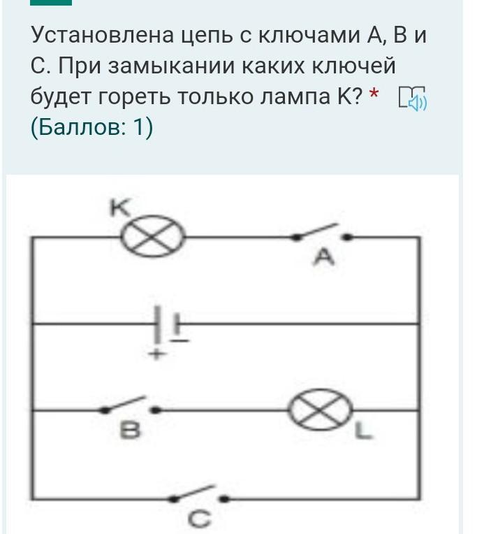 Установлена цепь с ключами A, B и C. При замыкании каких ключей будет гореть только лампа K? ЗАРАНЕЕ СПАСИБО