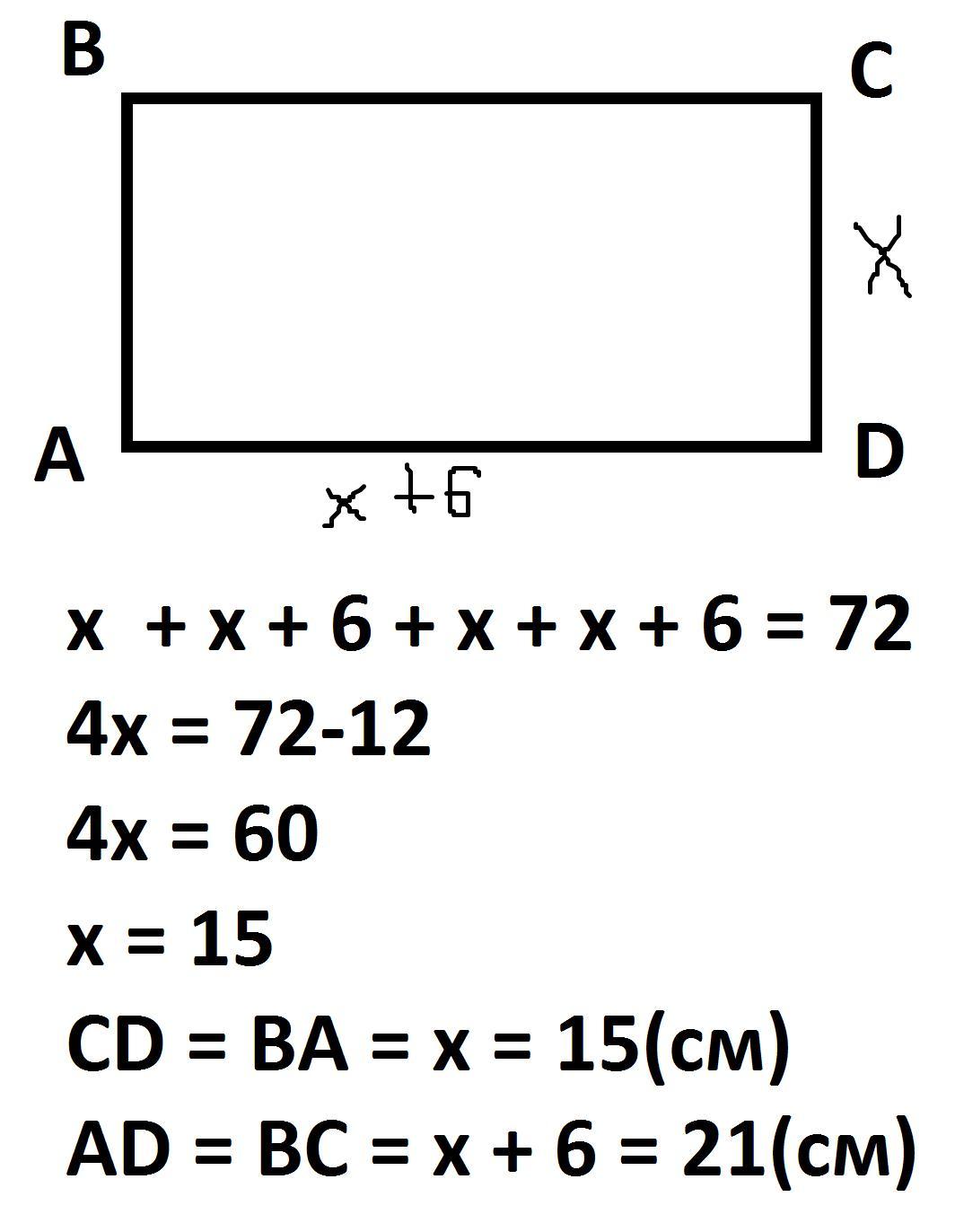 одна із сторін прямокутника на 6 см менша за другу .Знайдіть периметр цього прямокутника , якщо його площя дорівнює 72 см (в квадраті)