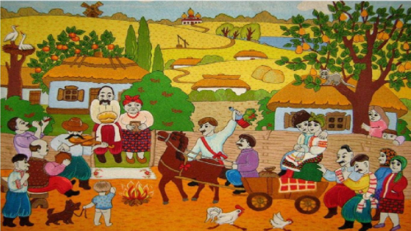 На заднем плане можно увидеть старые хаты с соломенной крышей. Также можно увидеть поле, аистов и много деревьев. На переднем плане можно увидеть много людей. Некоторые из них играют на музыкальных инструментах и поют. Некоторые сидят на конях. Также можно увидеть детей и животных и 2 человек держат коровай. Также на дороге горит костёр. Скорее всего это свадьба.